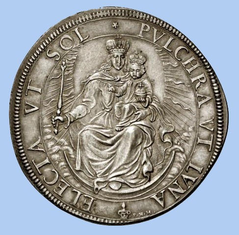 Die Rückseite zeigt uns ähnlich wie beim Taler von 1622 die Muttergottes als Himmelskönigin. Als Umschrift wurde, sicherlich vom Bischof selbst, ein Teilvers aus dem Hohelied Salomos gewählt, einer alttestamentlichen Sammlung von Liebestexten. Der wohl aus der Zeit des Hellenismus, also einige Jahrhundert vor Christus, stammende Text (Kapitel 6 Vers 9) lautet vollständig: quae est ista quae progreditur quasi aurora consurgens pulchra ut luna electa ut sol terribilis ut acies ordinata (Wer ist diese, die hervorbricht wie die Morgenröte, schön wie der Mond, auserwählt wie die Sonne, schrecklich wie Heerscharen?). In christlicher Zeit wurde der auch auf der Münze angebrachte Teilvers zum Lobe Marias umgedeutet.