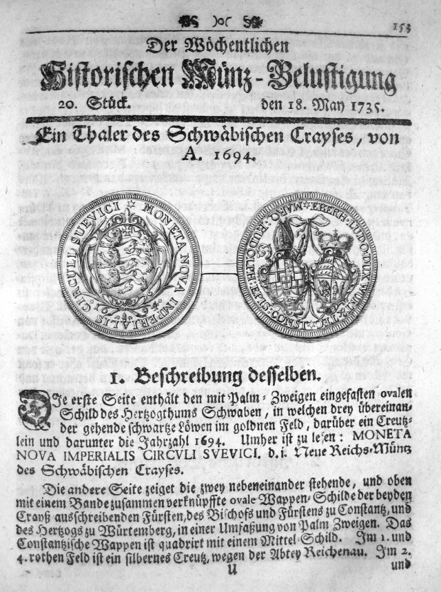 Auch in den Jahrgang 1735 der „Wöchentlichen Historischen Münz-Belustigung“ von Johann David Köhler wurde der Kreistaler aufgenommen. Die ersten beiden Seiten seiner Beschreibung folgen unten, die weitere Beschreibung gilt hauptsächlich den rechtlichen Gegebenheiten des Kreises und nicht mehr unseren Münzen, sodass auf eine Abbildung verzichtet wird.