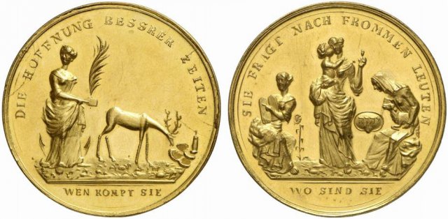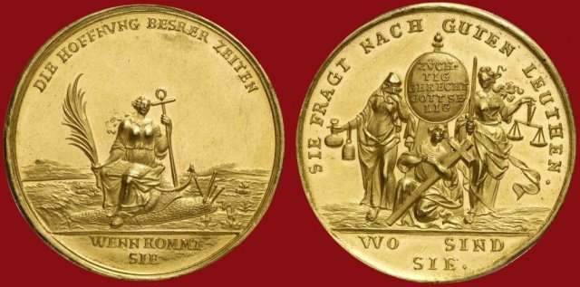 Das dargestellte Sinnbild ist wohl immer gültig: Man hofft auf bessere Zeiten, doch sie sind noch weit entfernt, denn die Hoffnung auf ihrer Schnecke befindet sich in einer leeren Landschaft ohne Städte oder Dörfer, hat noch einen weiten Weg bis zu uns Menschen vor sich und kommt nur im Schneckentempo voran. Sie trägt einen Palmzweig als Zeichen des notwendigen Friedens und einen Anker, um am ausgewählten Ort sich festzumachen und äußeren Bedrängnissen zu wiederstehen. Und auch die Frage, wo die guten Leute sind, die moralisch integer für Ordnung und Gerechtigkeit stehen und nach Aussage der Medaille für bessere Zeiten erforderlich sind, ist heute noch so aktuell wie vor 200 Jahren.