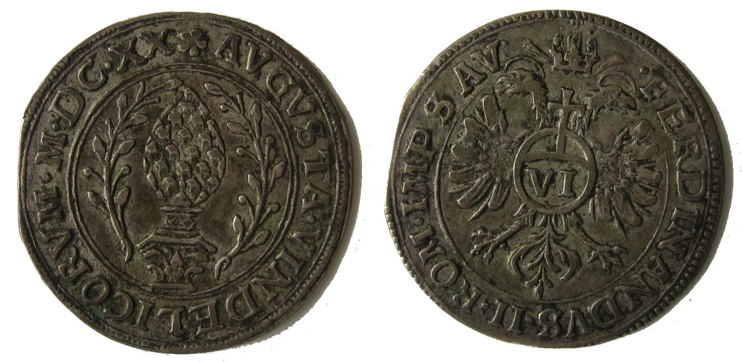 | Revers | FERDINANDVS II ROM IMP S AV — Unter der Kaiserkrone der bescheinte Doppeladler, auf der Brust den Reichsapfel mit der Wertzahl VI. |