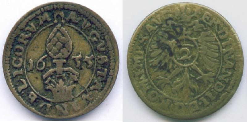 | Avers | AVGVSTA VINDELICORVM — Das Stadtpyr, zu dessen seiten 16 - 35 in einem Ringe, oben in der Umschrift ein Hufeisen. |