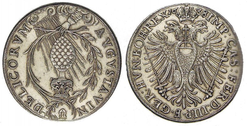 | Avers | AVGVSTA VIN - DELICORVM — Das von der Sonne beschienene Stadtpyr zwischen Palme und Lorbeerzweig, welche oben von einer Hand aus Wolken gehalten werden; unten ein Hufeisen. |
