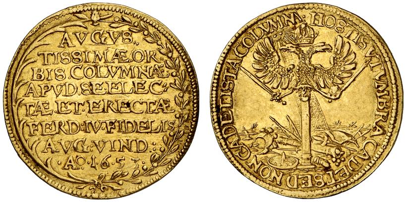 AVGVS/TISSIMÆ OR / BIS COLVMNÆ / APVD SE ELEC-/ TAE ET ERECTÆ / FERD IV FIDELIS / AVG VIND / A 1 6 53 — Umrahmung von Palme und Lorbeer, oben das Stadtpyr, unten drei Hufeisen |