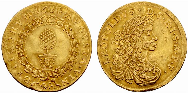 | Avers | AVGVSTA VIN - DELICORVM + 1688 + — wie der vorstehende Dukat |