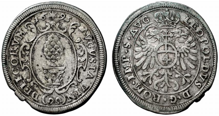 | Avers | AVGVSTA VIN - DELICORVM — Das Stadtpyr in ovaler, verzierter Einfassung; oben 16 95, unten zwei Hufeisen. |