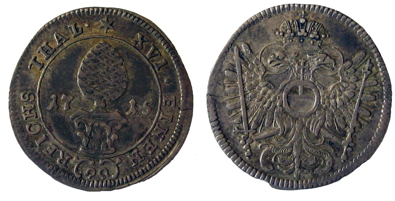 | Avers | XVI EINEN - REICHS THAL — In einem Ringe das Stadtpyr, zu dessen Seiten 17 - 15; unten zwei Hufeisen. |