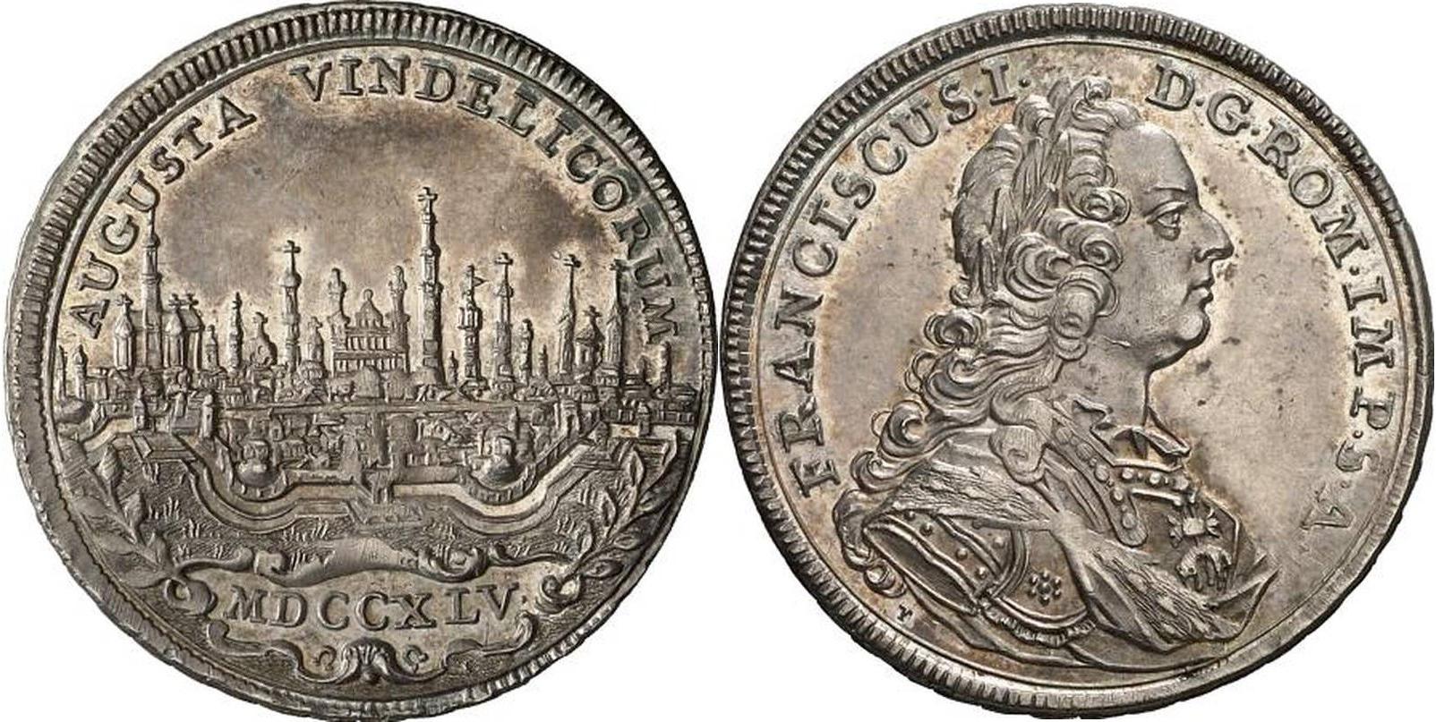 | Avers | AUGUSTA VINDELICORUM — Die Ansicht der Stadt von Osten; darunter in einer Einfassung, von der Ölzweige auslaufen MDCCXLV und zwei Hufeisen. |