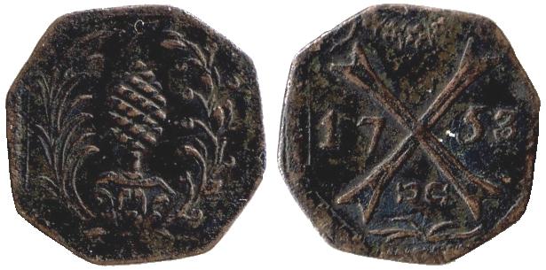| Revers | Malteserkreuz; im oberen Winkel eine Guirlande von fünf Röschen, in den mittleren 17-53 , im unteren zwei Hufeisen über gekreuzten Palmen. |