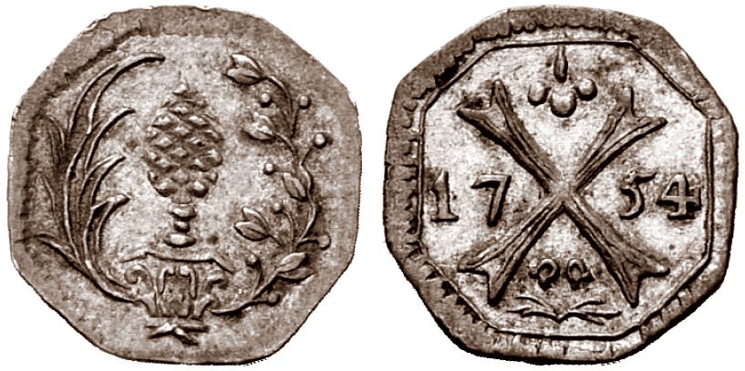 | Revers | wie der Vorstehende, nur hängt das Kleeblatt und unter den Hufeisen sind gekreuzte Palmen. |