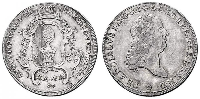 | Avers | AVGVSTA VINDEL AD - NORM CONVENT 1760 — Das Stadtwappen in reicher, mit Blumenguirlanden verzierter, von der Mauerkrone bedeckter Einfassung. Unten XX 1 FM über zwei Hufeisen. Links T |