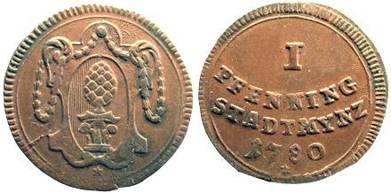 | Revers | (bogig) I PFENNING STADTMYNZ 1780 |