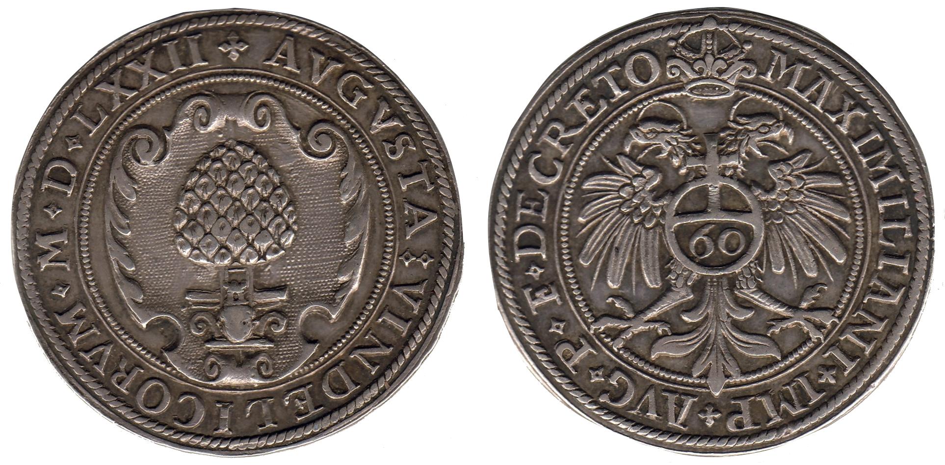 | Avers | AVGVSTA VINDELICORVM M D LXXII — Das Stadtpyr in einem deutschen mit Schnitzwerk verzierten Schilde, dessen Grund punktiert ist. |