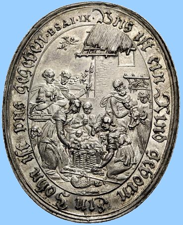Dargestellt ist die Anbetung des neugeborenen Jesuskindes durch die Hirten zu Bethlehem. Die Umschrift gibt einen Vers des Alten Testamentes, Jesaia 9.6, wieder.