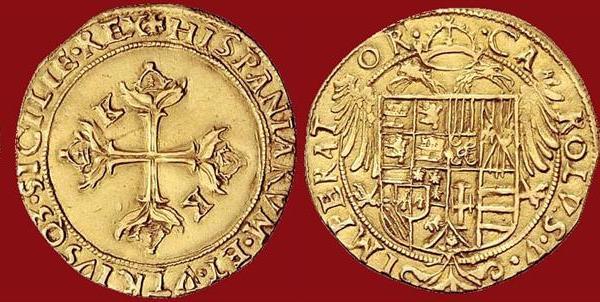 Für sein Königreich Spanien ließ Karl Excelentes ausgeben, Goldmünzen, die aus dem 24-karätigen Gold der gerade entdeckten Neuen Welt geprägt wurden – reiner ging es nicht. Doch um 1530 drohte der Nachschub an Gold aus den amerikanischen Kolonien bereits wieder zu versiegen; das gelbe Edelmetall wurde wieder knapp in Europa. Die europäischen Herrscher besorgten sich deshalb Karls Excelentes, schmolzen sie ein, mischten Silber unter das reine Gold und ließen aus diesem schlechteren Gold wiederum Münzen schlagen. 1536 führte Karl deshalb in Spanien eine neue, weniger reine Goldmünze ein. Das war der Escudo d’oro, der unter dem Namen Scudod'oro ab 1538 auch in Neapel ausgegeben wurde. Er zeigte auf der Vorderseite einen Schild (Spanisch escudo, Italienisch scudo), und auf der Rückseite ein Kreuz.“