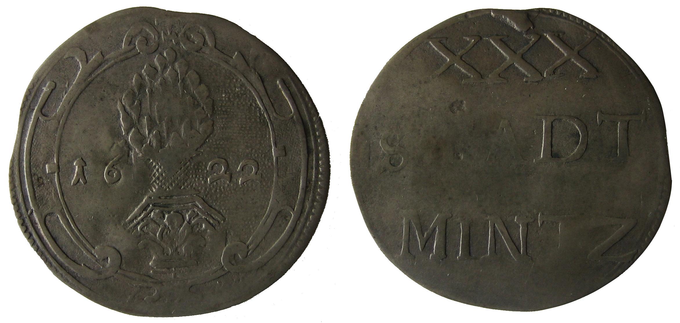 Avers | 16 - 22 — In ovaler Umrahmung das Stadwappen; zu den Seiten des Pyr 16 - 22. |