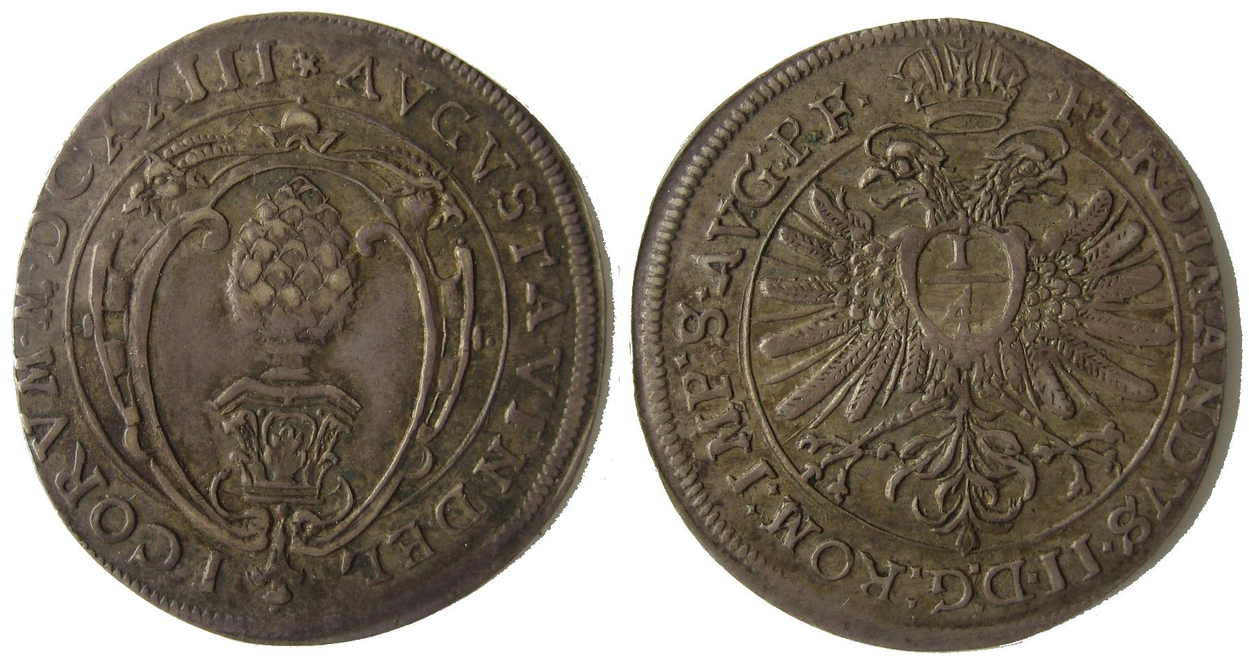 | Avers | AVGVSTA VINDEL - ICORVM M DCXXIII — Das Stadtpyr in reicher Umrahmung, das unten in eine Blume ausläuft |