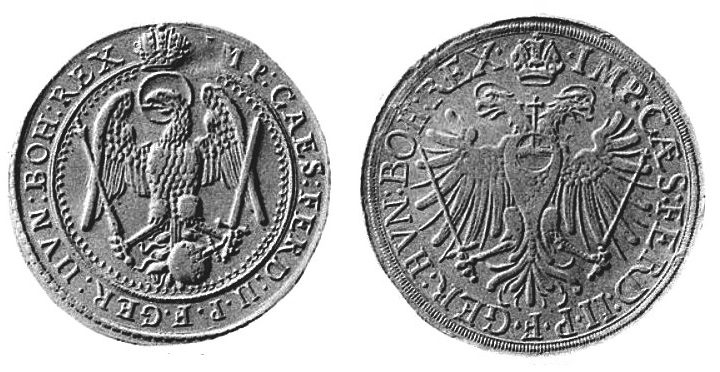 IMP CAES FERD II P F GER HVN BO REX — Unter der Kaiserkrone in schön verziertem Kreis der einköpfige, rechts schauende Reichsadler, im linken Fange das Schwert, im rechten das Szepter, in den Schwanzfedern den schief liegenden Reichsapfel |