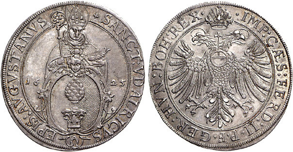 SANCT VDALRICVS - EPIS AVGVSTANVS — Das Stadtwappen in ovalem, oben einen geflügelten Engelskopf tragenden Rahmen. Darüber die halbe Figur des hl. Ulrich, den Bischofsstab in der rechten, ein Buch, auf dem ein Fisch liegt, in der linken Hand, auf dem Haupte die Inful. Zu den Seiten 16 - 25, |