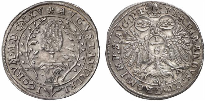 | Revers | FERDINANDVS II D G ROM IMP S AVG P F — Der bescheinte Doppeladler unter der Kaiserkrone, auf der Brust ein Oval mit 1/6 |