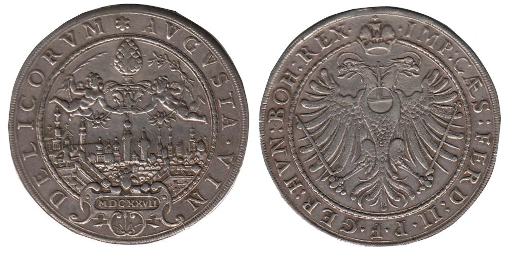 AVGVSTA VIN - DELICORVM — Die Ansicht der Stadt, darüber das Stadtpyr von zwei Engeln getragen, von welchen der linke eine Palme, der rechte einen Ölzweig hält und beide noch Blumengebimde an einem um das Pyr laufenden Bande. Unten ein Schild mit MDCXXVII und drei Kornähren. |