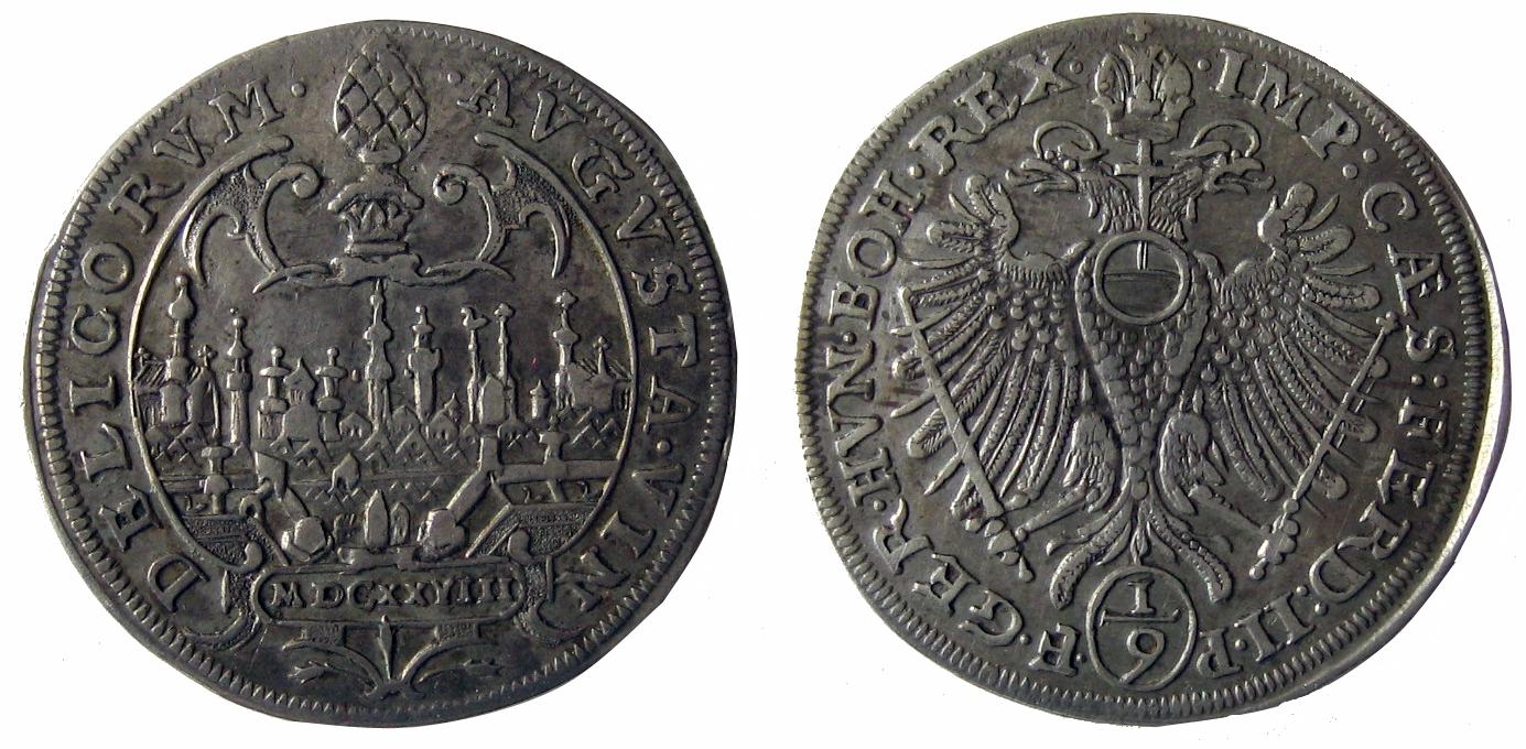 AVGVSTA VIN - DELICORVM — Stadtansicht in einem Rahmen von Schnitzwerk, der vom Stadtpyr bekrönt ist; von diesem hängen Festons von Früchten herab. Unten ein Schild mit MDCXXVIII und drei Kornähren |