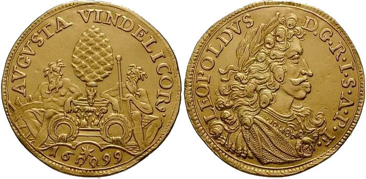| Avers | AVGVSTA VINDELICOR' — Das Stadtpyr zwischen den Flussgöttern Lech und Wertach; unten 16 - 99 , dazwischen über zwei Hufeisen. |
