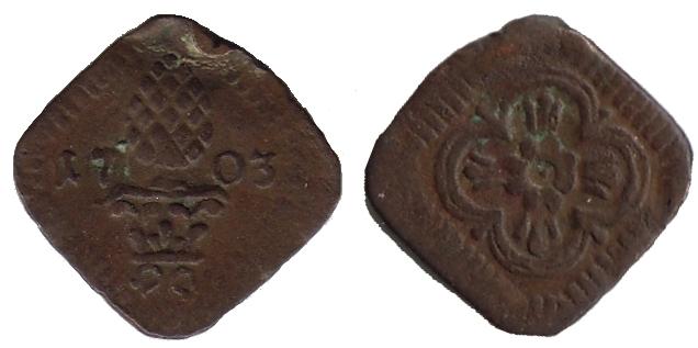 | Avers | In gestricheltem Rahmen das Stadtpyr, zu dessen Seiten 17 - 03 , unten zwei Hufeisen. |