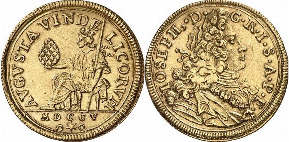 | Avers | AVGVSTA VINDE - LICORVM — Die sitzende Augusta mit der Mauerkrone, auf der rechten Hand den Pinienzapfen, in der linken den Freiheitsstab. I. A.: MDCCV, darunter zwischen zwei Hufeisen. |