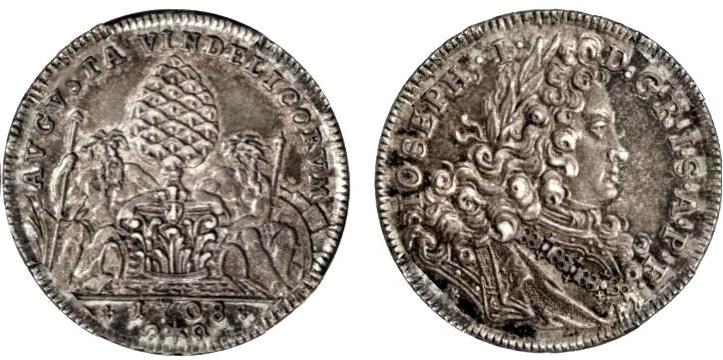 | Avers | AVGVSTA VINDELICORVM — Das Stadtpyr zwischen den zwei Flussgöttern. I.A.: 17 - 08 ; darunter zwischen zwei Hufeisen |