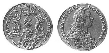 | Avers | AUGUSTA - VINDELICORUM — Das Stadtpyr in einer reichen, von der Mauerkrone bedeckten Einfassung von Blattwerk, das mit Blumen verziert ist. An den Seiten MDCC - XLV; unten zwei Hufeisen. |