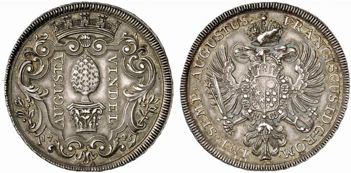 In einem reichen Rahmen von Schnitzwerk, der mit Ölzweigenbesteckt und mit der Mauerkronegeschmückt ist, das Stadtpyr. Links von diesem AUGUSTA aufsteigend, rechts VINDELIC absteigend. Seitwärts 17 - 45 , unten zwei Hufeisen.. |