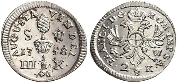 | Avers | AUGUSTA - VINDEL — Das Stadtpyr, zu dessen Seiten S - W 17 - 58 Unten ( III ½ K und zwei Hufeisen. |
