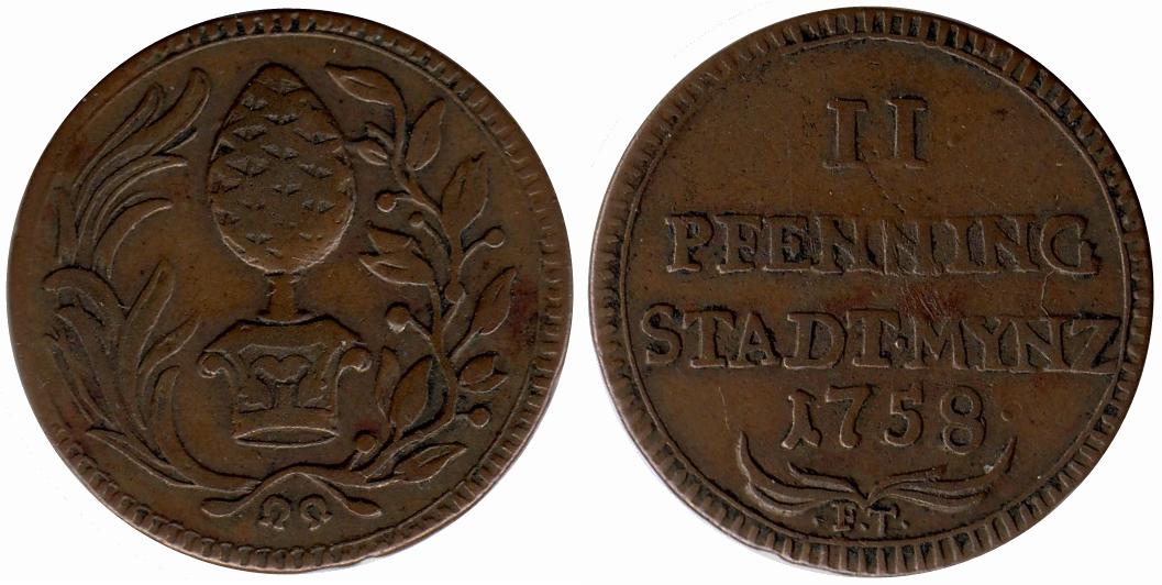 | Revers | II PFENNING STADTMYNZ 1758 — Unten zwei gekreuzte Palmen über F T |