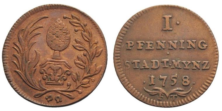 | Revers | I PFENNING STADT MYNZ 1758 — Unten zwei gekreuzte Palmen über F - T |