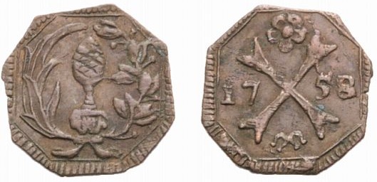 | Revers | Malteserkreuz; im oberen Winkel ein Röschen, in den mittleren 17 - 58 , im unteren zwei Hufeisen. |