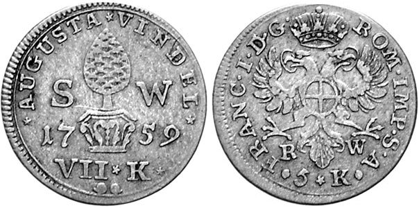 | Avers | AUGUSTA VINDEL — Das Stadtpyr, zu dessen Seiten S - W 17 - 59 ; unten VII K und zwei Hufeisen. |