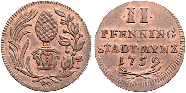 | Revers | II PFENNING STADT MYNZ 1759 |