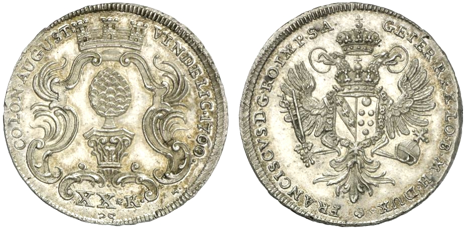 | Avers | COLON AUGUSTA VINDELICO 1760 — Das Stadtpyr zwischen Palmen; darunter in hübscher Einfassung X K Am Rande zwei Hufeisen zwischen Punkten; rechts |