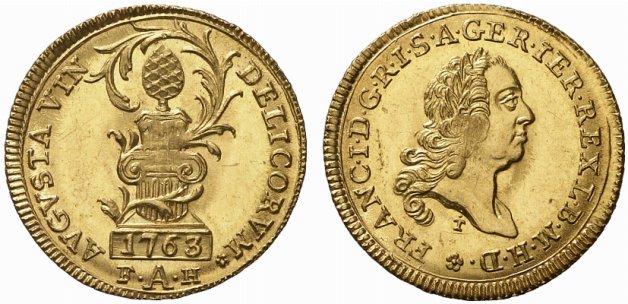 | Avers | AVGVSTA VIN - DELICORVM — Das Stadtpyr auf einer niederen Säule, an deren Fussplatte 1763 ; eine Palme schlingt sich um die Säule und bildet einen Bogen um das Pyr; unten F A H |