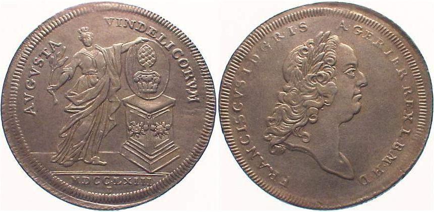 AVGVSTA - VINDELICORVM — Die stehende Augusta, mit der Mauerkrone geschmückt, hält in der rechten Hand einen Ölzweig, mit der linken das auf einem blumengeschmücktem Postamente stehende, ovale Stadtwappen. I.A.: MDCC LXIII T |