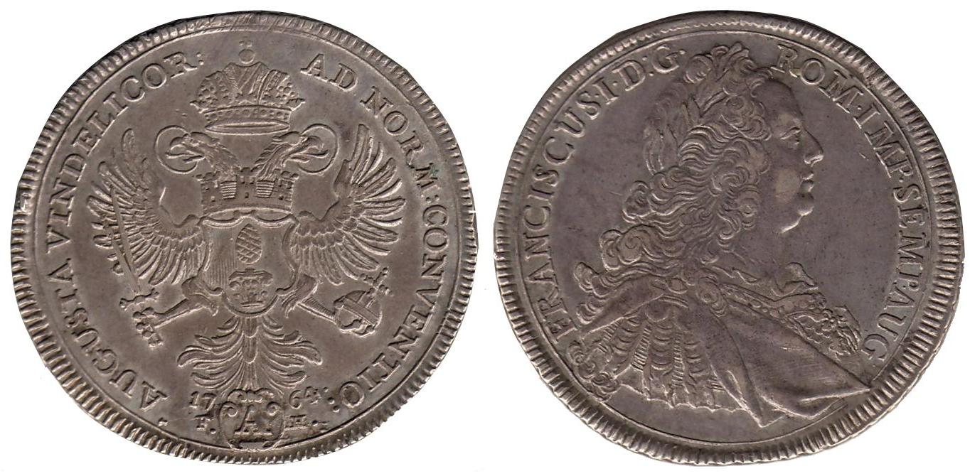 AUGUSTA VINDELICOR - AD NORM CONVENTIO — Der bescheinte Doppeladler unter der Kaiserkrone, im rechten Fange Szepter und Schwert, im linken den Reichsapfel, auf der Brust das von der Mauerkrone bedeckte Stadtwappen. Unten 17 - 64 , darunter F (A) H ; links seitwärts T |
