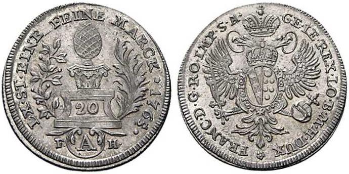 LX ST EINE FEINE MARCK 1765 F (A) H — Das Stadtpyr auf Postament mit Wertzahl 20 zwischen Palm- und Lorbeerzweig |