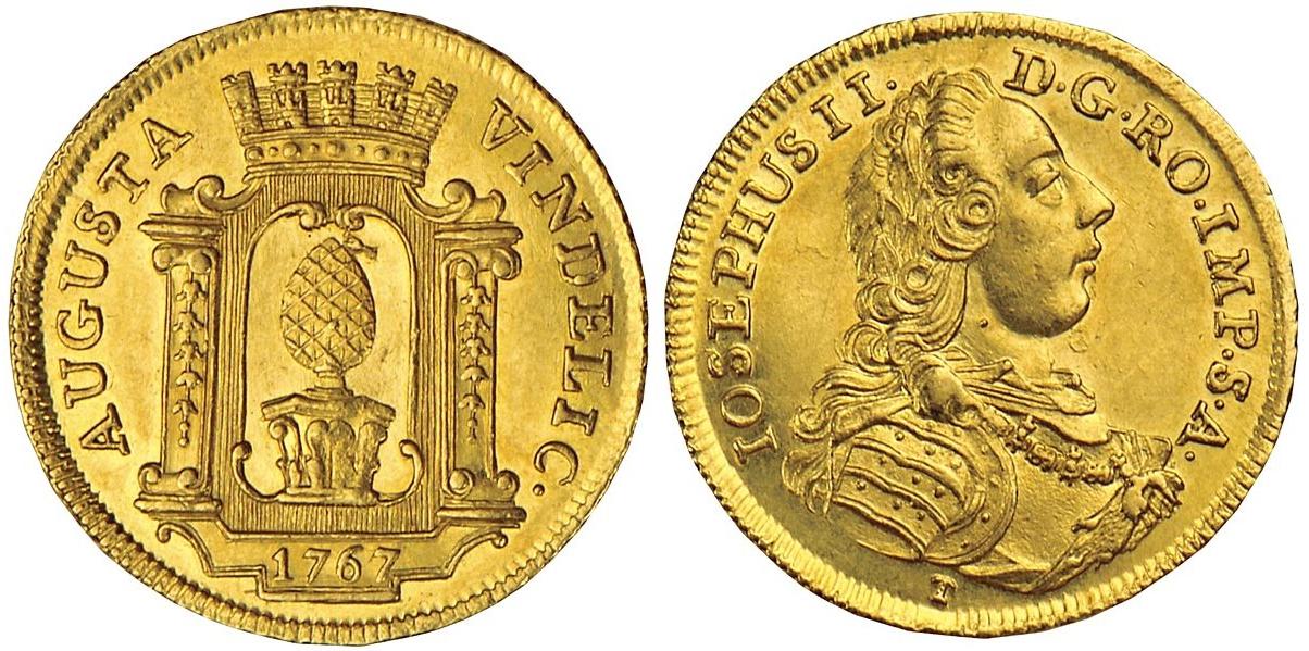 | Avers | AUGUSTA - VINDELIC — Stadtpyr in architekt. Umrahmung mit Mauerkrone, unten 1767 |