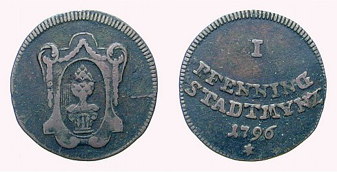 | Revers | (bogig) I PFENNING STADTMYNZ 1796 |